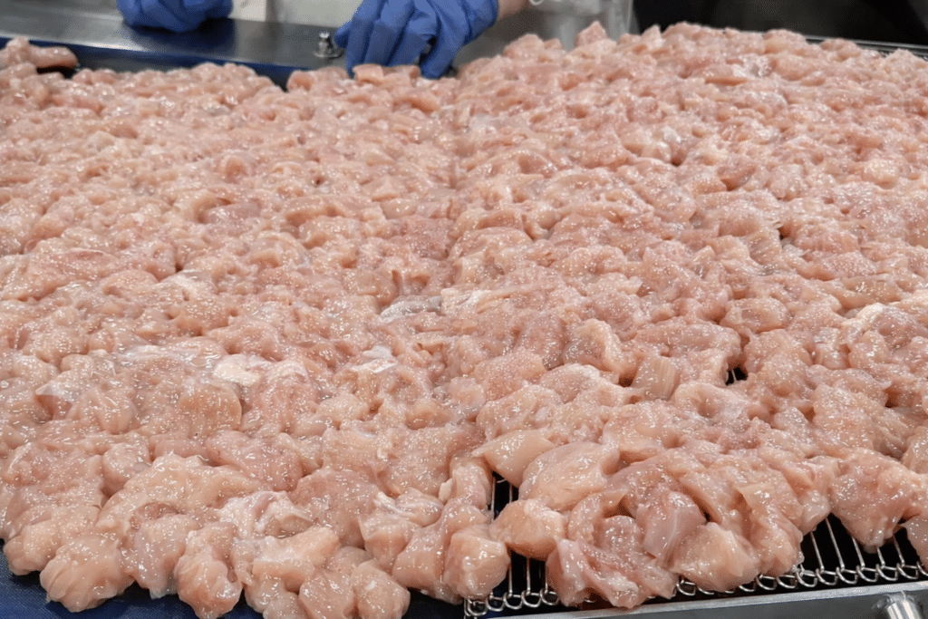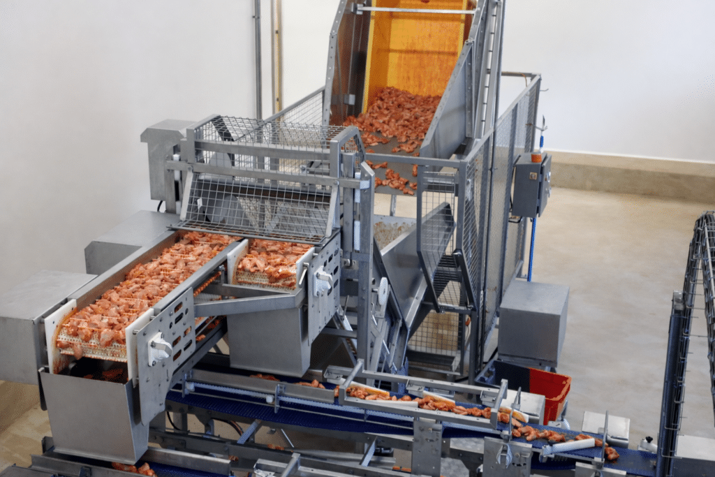 Forts de notre expérience, nous concevons des solutions de chargement et de répartition de produits en vrac adaptées aux exigences de l’industrie agroalimentaire, notamment pour les produits de volaille tels que filets, aiguillettes, pilons ou émincés.