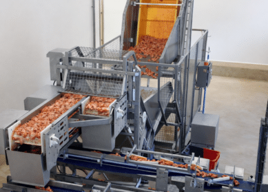 Depuis un basculeur de bac ou un îlot de déballage, alimentez automatiquement vos fours en produits crus ou surgelés grâce à un réseau de convoyeurs à maille modulaire. Chacune de nos solutions allie délicatesse et efficacité afin de respecter l’intégrité de vos produits et de maximiser votre production.